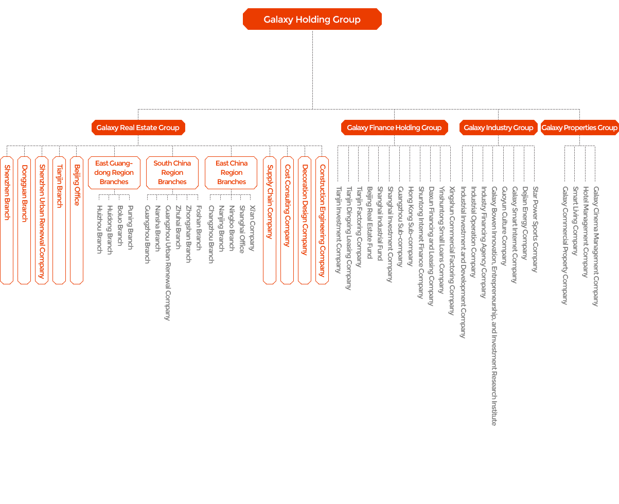 Galaxy Holding Group, founded in 1988,has become a large-scale comprehensive investment group, with five major business groups: real estate, finance, industry, commerce, and property. We cover varied businesses including real estate development, urban renewal, business operation, hotel management, property services, finance and investment, and industrial operations.
