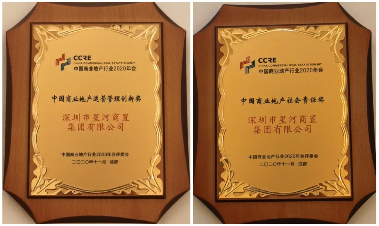 2020年11月17日, 由全国工商联主管的全联房地产商会商业地产工作委员会主办,中华全国商业信息中心、成都市商务局、华夏时报、吴晓波频道、场景实验室联合主办的“中国商业地产行业(第十七届)2020年会”暨颁奖盛典在成都世纪城国际会议中心隆重举办。星河商置凭借卓越业绩表现、管理思路的不断创新和抗击疫情的有力举措,荣获“中国商业地产运营管理创新奖”和“中国商业地产社会责任奖”!